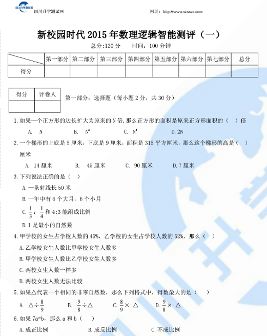新校园时代2015年数理逻辑智能测评(一)