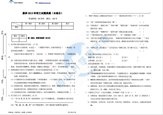嘉祥2013小升初语文试题真题本地生