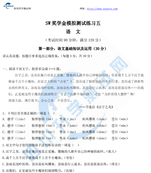 SW奖学金测试模拟练习(五)语文